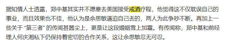 不过,郑中基去了美国后,有知情人士透露说:在治疗期间,他和妻子余思敏发生了激烈的争吵。而且,郑中基本人其实并不太想出国戒酒,之所以去美国,完全是因为妻子余思敏“逼”的。