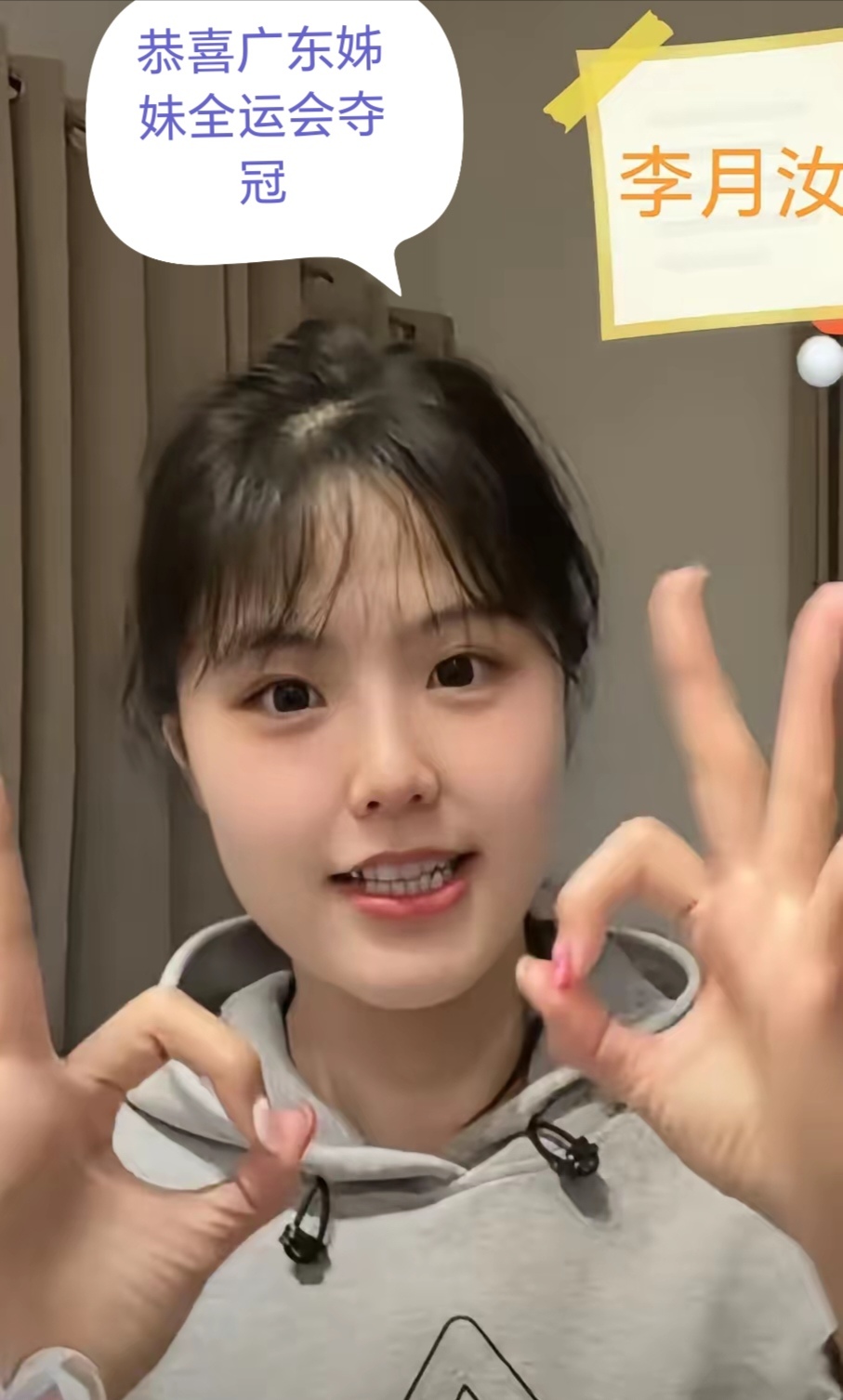 广东女篮夺冠,原中锋李月汝因伤未能如愿参与,遗憾当电视机前观众,送来深深祝福:广东女篮姐妹们我爱你们!