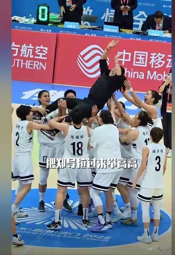 广东全运会女篮主教练是62岁的郑薇,是中国女篮世界杯亚军主教练,赛后队员把她高高拋起。