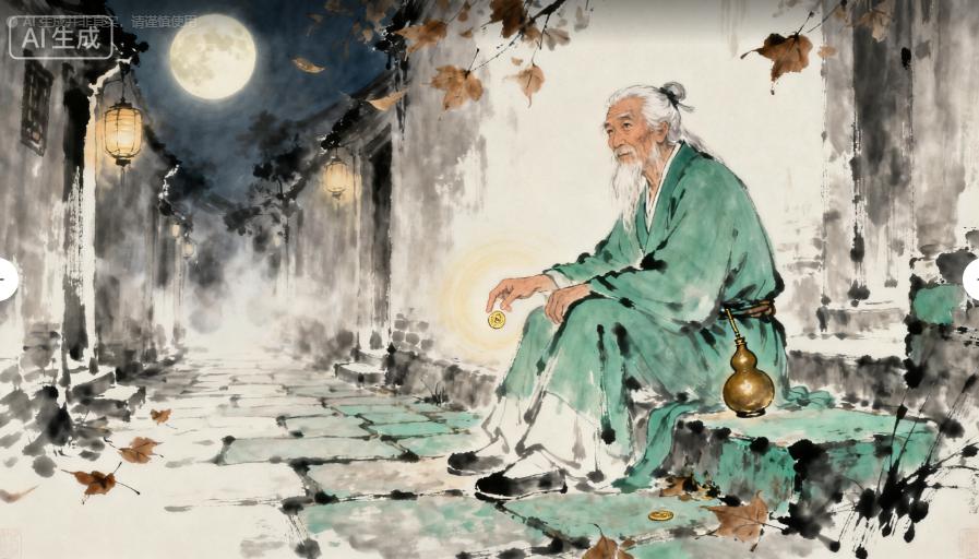 走出玄妙观,天色已经黑了,街上的店铺大多关了门,只有几家灯笼铺还亮着灯。沈万和无精打采地走着,突然,一阵风吹来,卷着几片落叶,落在他脚边。他抬头一看,前面不远处的巷口,坐着一个穿青色长衫的老者,手里拿着个酒葫芦,正慢悠悠地喝着酒。那老者须发皆白,脸上却没什么皱纹,眼神清亮,手里还把玩着一个铜钱,铜钱在他指间转着圈,发出 “叮铃” 的轻响。