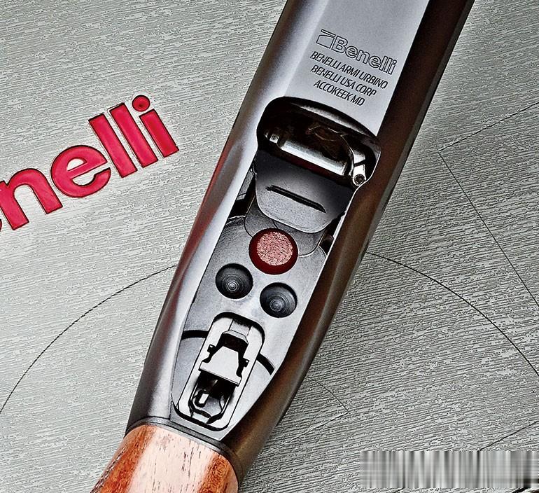 这种设计与抛壳系统相结合,好处是无需在锁定装置和抛壳器之间设置复杂的联动机构,枪身框架内也不用布置击发连杆或扳机连杆,大大简化了制造工艺。由于不再需要为待击发动作提供动力,828U的枪管开启更加轻松,不过这点在轻型猎枪上可能更明显,对于这款重型竞技枪支来说,效果没那么显著。贝内利还巧妙地改进了这个系统,将顶部杠杆向左弯曲,让它更靠近射击手的拇指(至少对右手持枪者是这样)。他们甚至还调整了序列号的刻印位置,让它位于重新定位后的杠杆下方。
