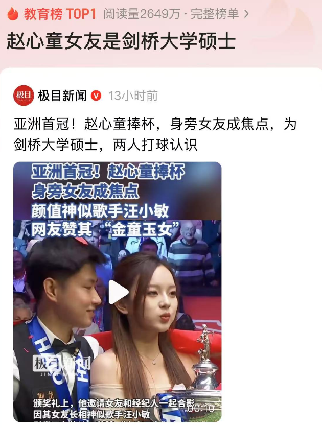 据媒体报道,赵心童女友是剑桥大学硕士,两人是在打球时认识的,果然优秀的人身边人也优秀,两人太般配了。