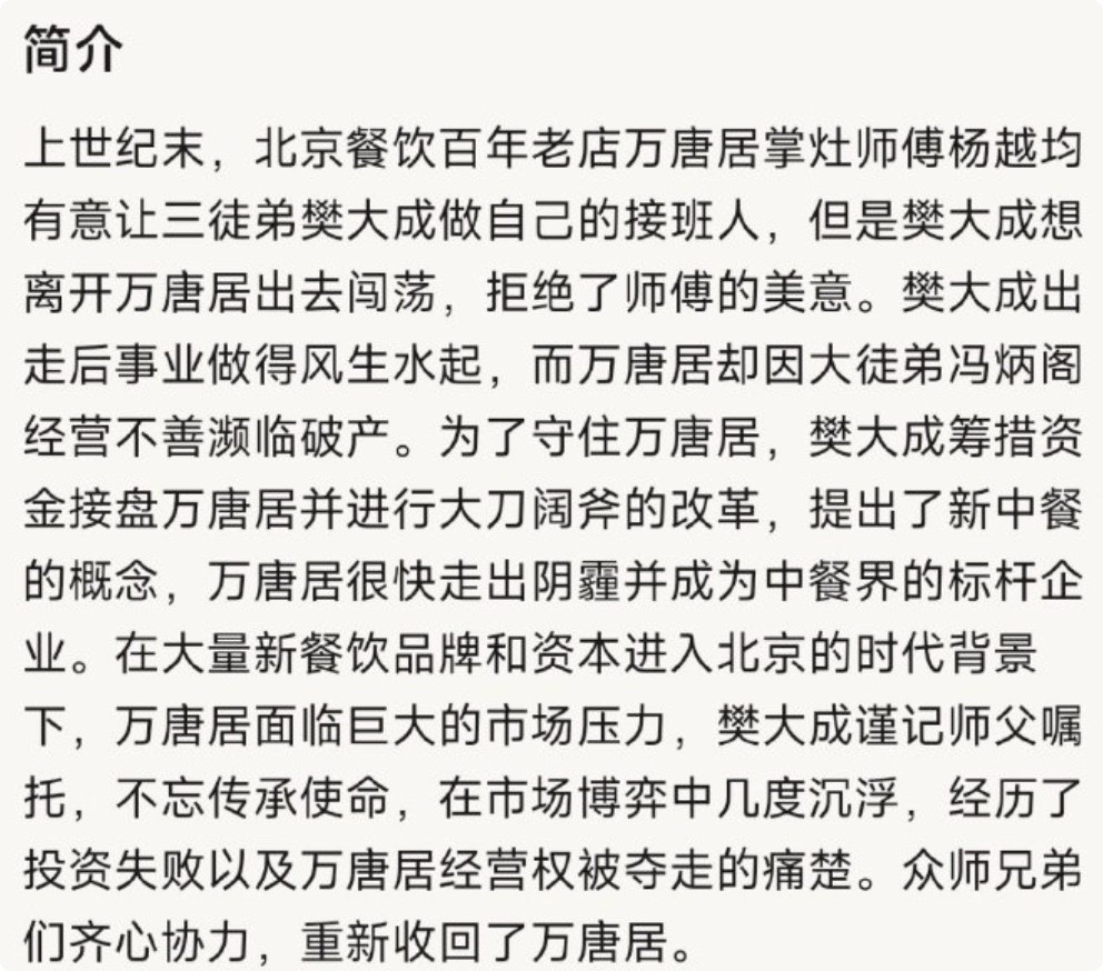 电视剧改编自获过《上海文学》中篇小说奖的《收山》,它没走常见的家庭伦理或爱情甜宠老路,而是把镜头对准了上世纪90年代北京老字号“万唐居”的灶台,用一道菜、一口锅讲透时代变迁里的守与变。