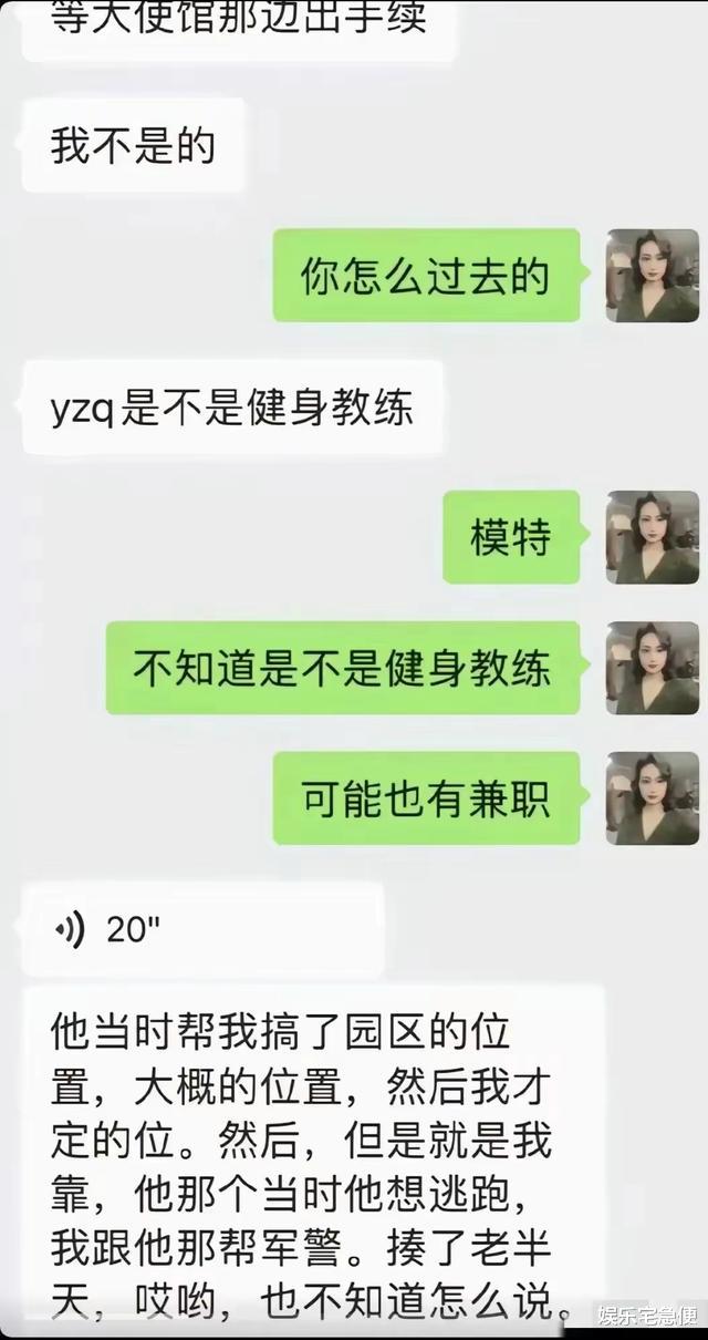 而园区内也有聊天记录传出,曝光了杨泽琪被关进去之后的情况。他是跟杨泽琪一起进去的人,经常在园区内碰到,分在了不同公司,吃饭时经常碰到,杨泽琪穿着一件绿色T恤,脸上带着伤,还曾经试图逃跑过,被发现后,被一顿揍,情况很不乐观。就算平安离开,估计也得好好养伤。