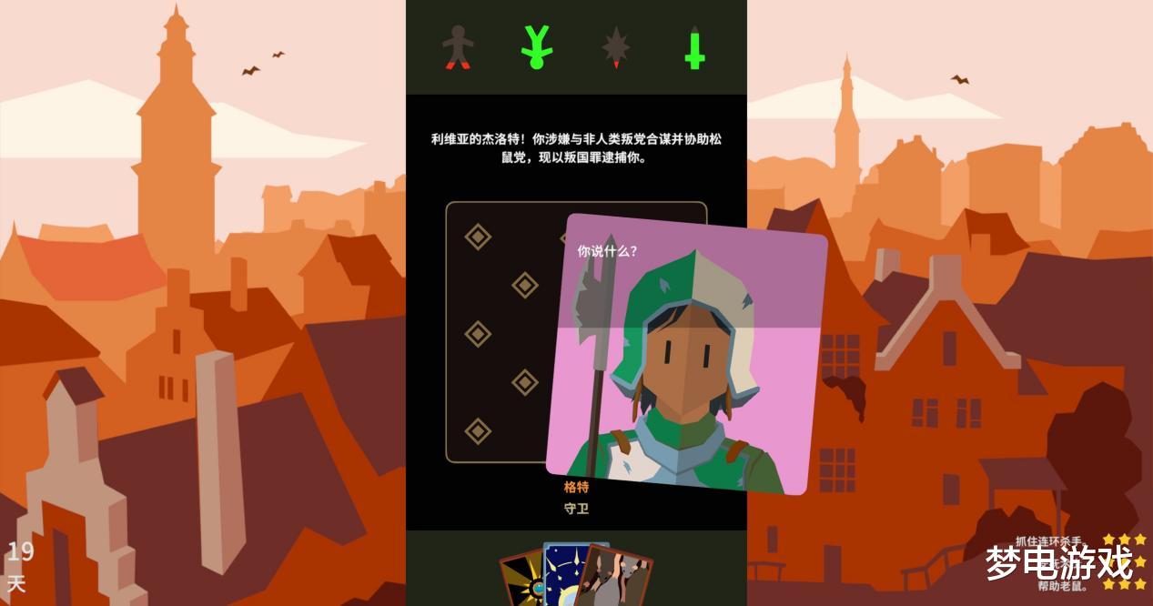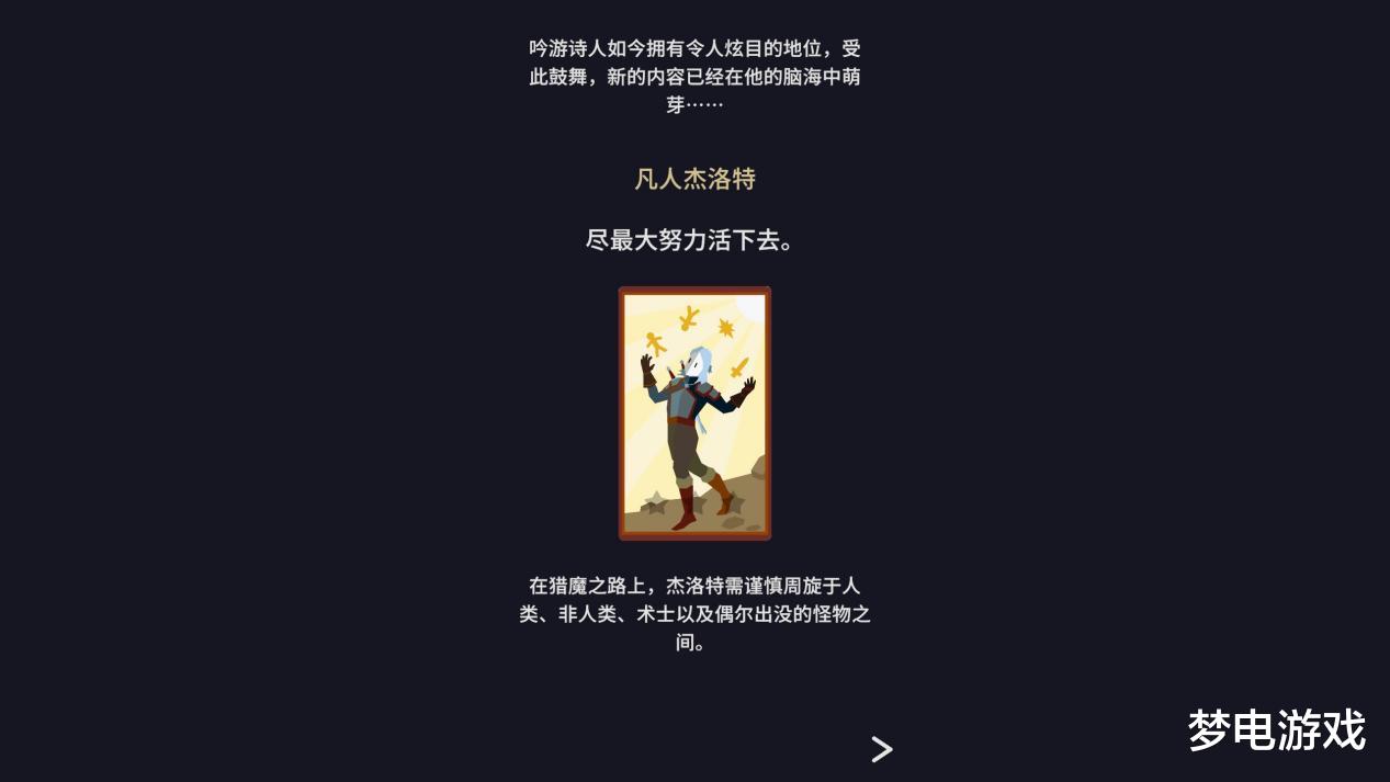 比如你可能在游戏中抽取到“凡人杰洛特”,那在故事中,杰洛特“猎魔人”的种族身份会变成凡人,同时增加人类角色对杰洛特的亲和度——不过因为《王权》的所谓“故事”本来就没有什么文本量,所以这个设定换句话说就是可以在某些选项中影响玩家获得的点数。