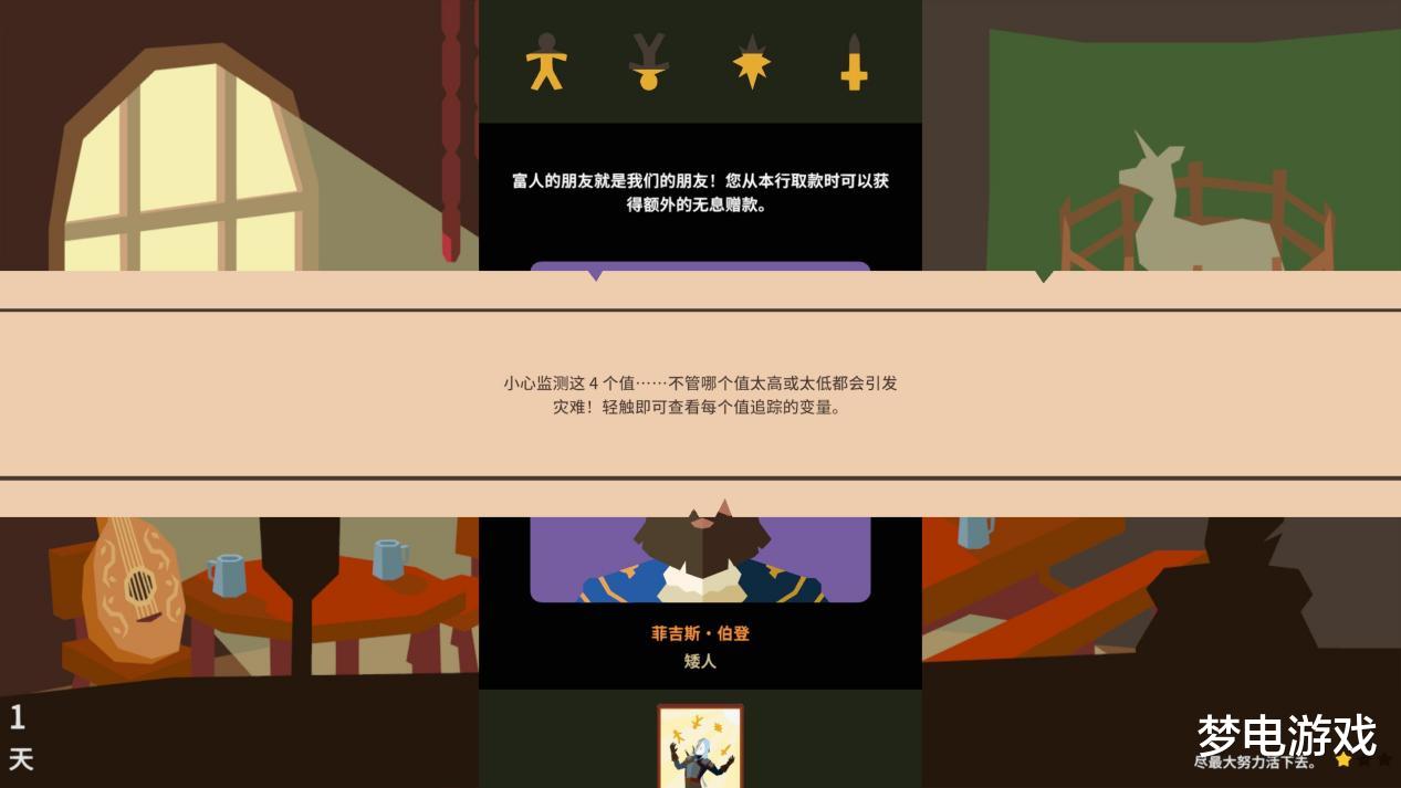 因为作为一个由DD发行的独立游戏,这款看上去像是需要玩家通过一系列双选题治理国家的系列作品,实际上是需要玩家在不知道选项后果的情况下,通过一系列双选题来控制四个不同数值的高低,避免使其过长或过低,并以此尽可能坚持更多的回合数。