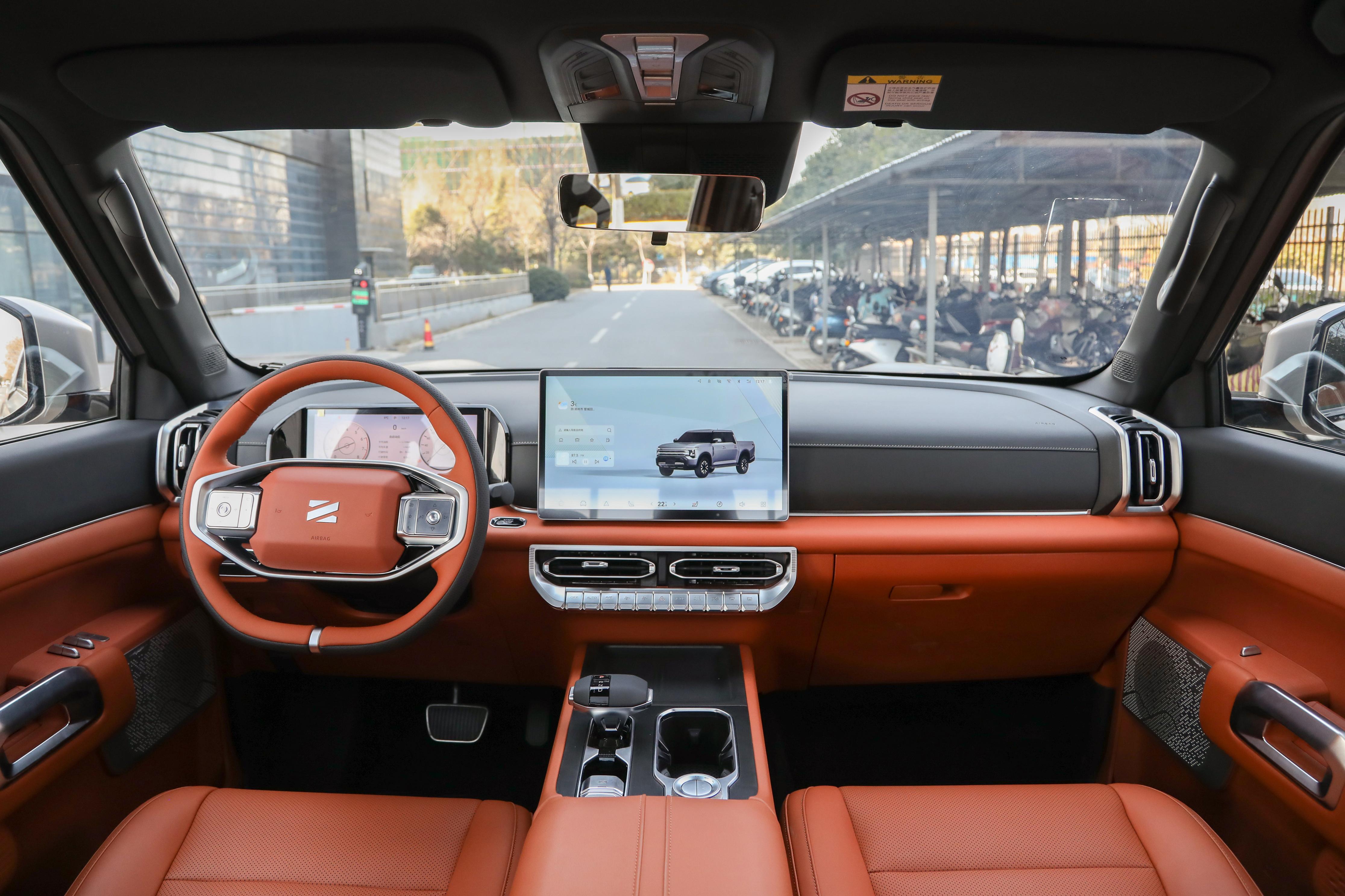 内饰设计保留了更多厚重感,中控台的方正形象已然给出答案,边框轮廓同样保持了沉稳气息,由此衬托比对,内饰材质主要以真皮以及织布拼接而成,展现高级感。运动座椅独特,两翼大面积凸出,能保障激烈驾驶时车内人员的安全姿态。14.6英寸大屏幕设计都显得有几分小巧,而且物理挡把控制设备得到保留,在内装形象上增添了几分传统经典的味道。多功能方向盘两侧设有多功能按键区域,大尺寸设计提供充足驾驶手感,运动感强。车机搭载内容也在与时俱进,车辆远程控制、智能语音交互,甚至连娱乐应用也有不少补充,抛开越野功能性拓展不看,单就满足家用移动空间需要都有可观表现。