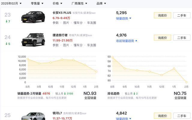 再看看它的市场表现。懂车帝销量数据显示,捷途旅行者最新2月销售4976辆,位列当月紧凑型SUV销量榜单第24位。这个销量数据虽然不是特别突出,但也说明它在市场上有一定的份额。随着2025款的上市,它在配置和性能上的提升,或许会在未来的市场中有更好的表现。