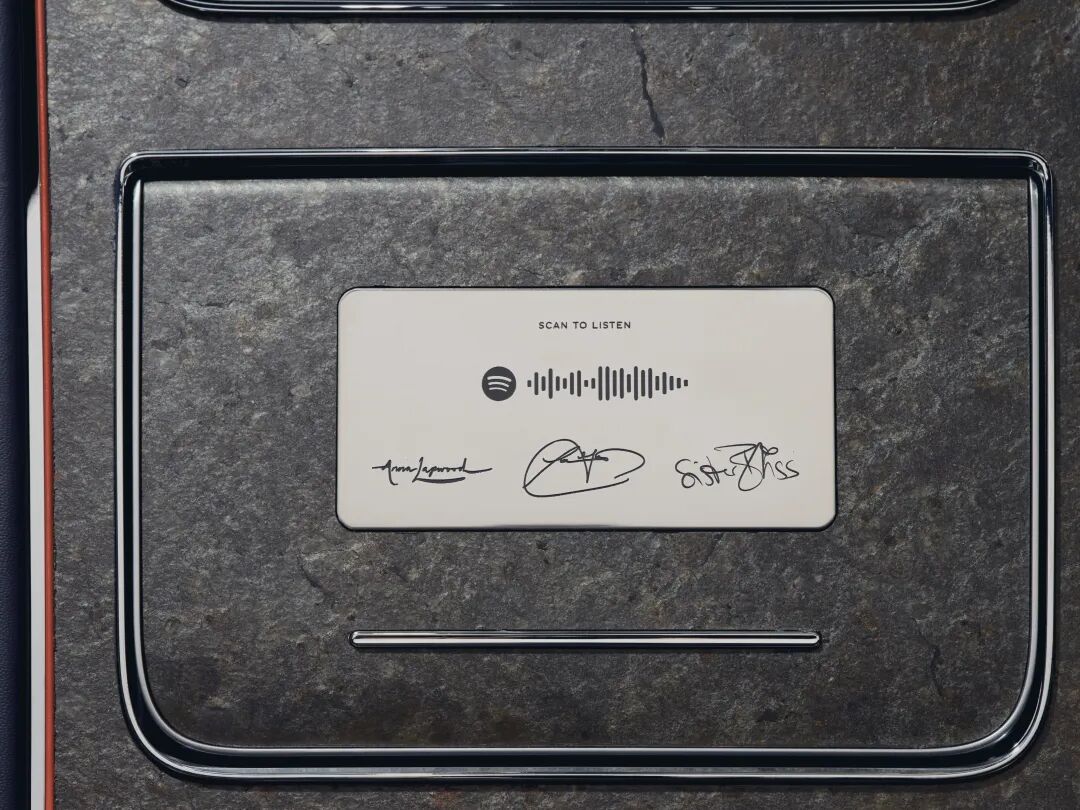 安娜·拉普伍德的独特贡献体现在宾利标志性的空调出风口“风琴音栓”式控制钮上,作为一名管风琴演奏家,她对此设计特别有共鸣。在这款全新的定制版欧陆GTC上,这些“音栓”控制钮采用了24K金装饰。最后的点睛之笔是中控台上的一个铭牌,上面印有一个Spotify二维码,扫描后可以跳转到由拉普伍德、郭和Sister Bliss共同策划的歌单。