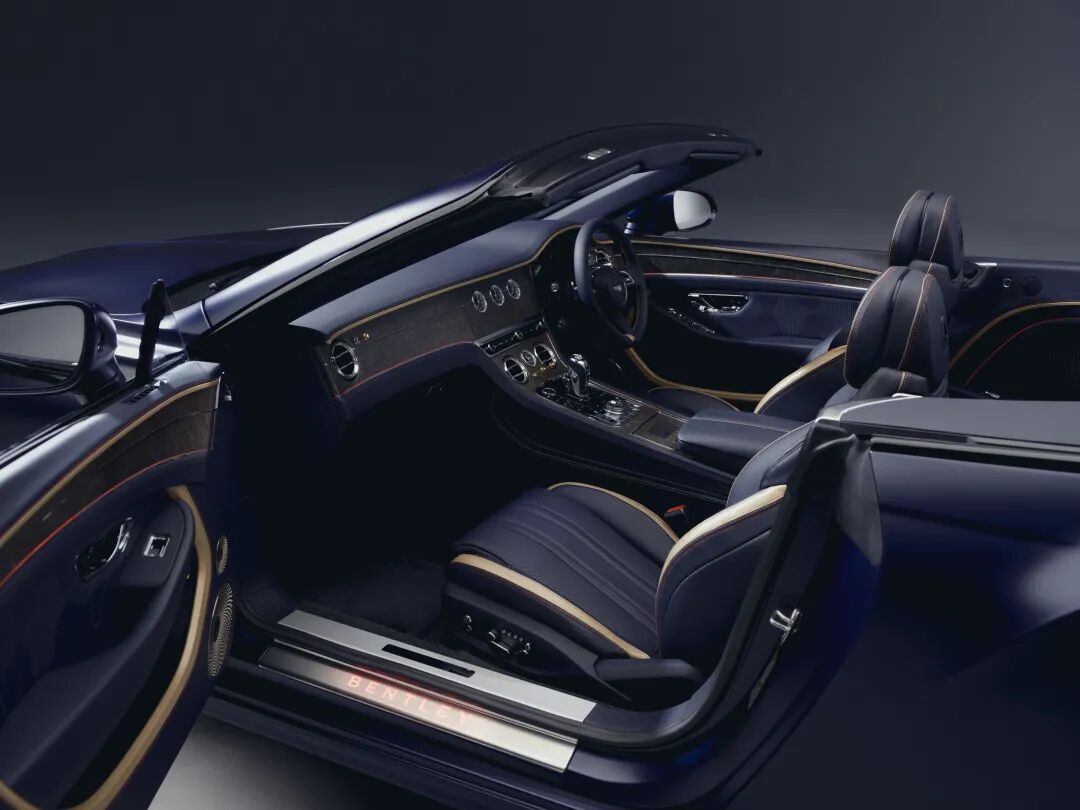 车身外观采用缎面效果的“孔雀”漆面,并以“龙卷风红”作为点缀色。内饰则选用“帝国蓝”为主色调,搭配金色和“邮筒红”作为点缀。对比色的缝线以及“铜石色”饰板进一步提升了整体的超豪华设计感。
