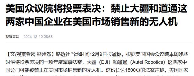 观察者网:美国众议院将投票表决:禁止大疆和道通这两家中国企业在美国市场销售新的无人机