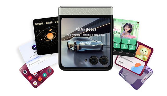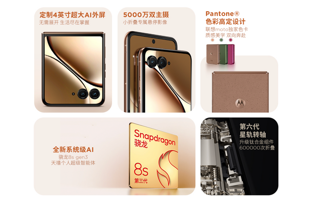该机采用定制4英寸大外屏(1272*1080),支持1-165Hz LTPO自适应刷新率,目前已经支持千款热门应用,可以轻松应对各种日常需求。采用新型钛合金转轴,康宁大猩猩玻璃盖板,支持IP48级别防尘防水认证。前置摄像头升级为5000万像素,后置5000万主摄+5000万超广角微距双摄组合,支持AI合影、实况照片和悬停自由拍等等。机身采用潘通色彩高定设计,内置立体双扬和X轴马达,支持系统级AI智能体。