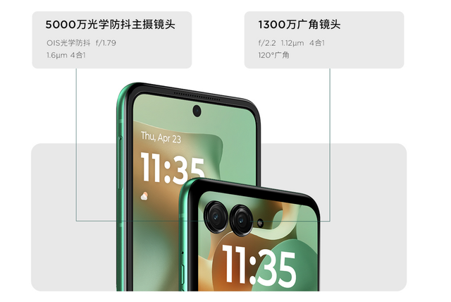 该机后置摄像头包括一个 5000 万像素主镜头(支持 OIS 光学防抖)和一个 1300 万像素超广角镜头(支持微距模式),前置摄像头则为 3200 万像素。