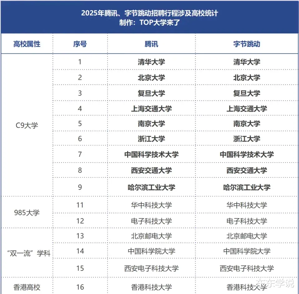 腾讯与字节公司2025年招聘宣讲即将开始,目标学校名单已经出来了,从两校交集的名单一共有15所,这是他们对高校实力的一次投票(它们对口的专业)。