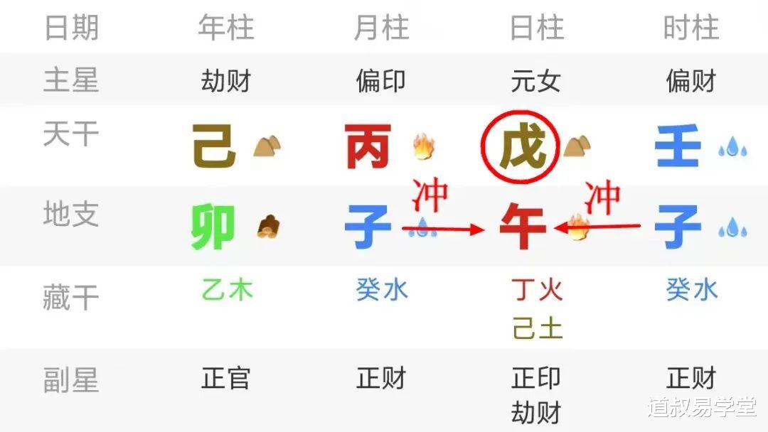 日主戊土坐下午火本为根基,却在双重冲击下沦为"无根之萍"。