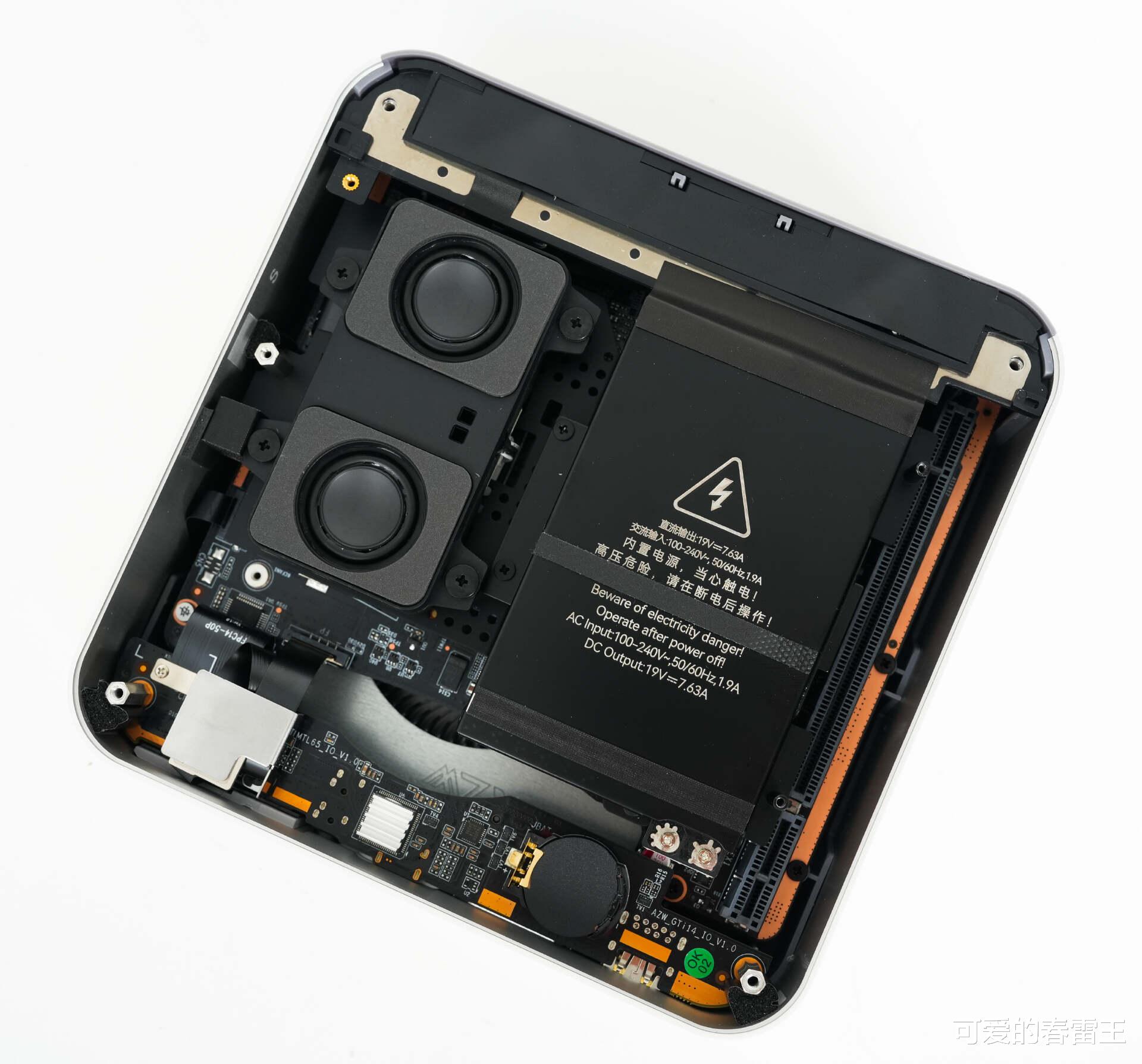 拆掉防尘网之后,机器的内部结构就完整地展现在眼前。整体布局虽然紧凑,但非常工整有序,看得出设计上花了不少心思。内部左侧配有一套立体声扬声器;右侧是145W的内置电源。拆卸时要注意先取下扬声器的排线,电源部分也记得揭开屏蔽布,避免硬拉损坏。这些细节设计既考虑了功能性,也照顾到了日常维护的便利性。