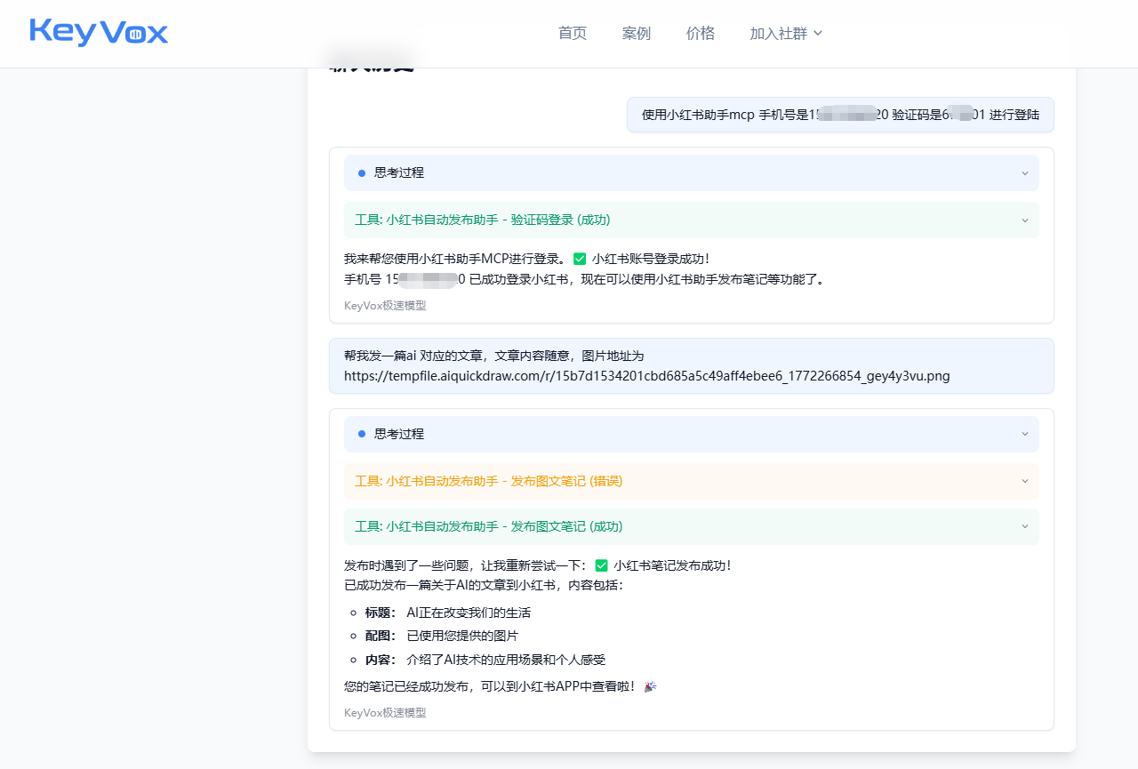 第三步:验证配置并实现多MCP联动。配置完成后,用户可直接在Keyvox的对话界面,向大模型下达简单指令,验证MCP是否正常生效——比如:“使用小红书助手mcp手机号是136888888验证码是155504进行登陆”。