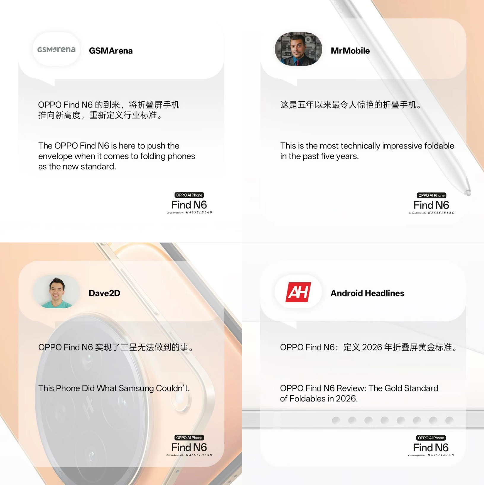 接着来看看海外媒体的点评,其中GSMArena认为OPPO Find N6的到来将折叠屏手机推向了新高度,重新定义了行业标准;而Dave2D更是锐评到OPPO Find N6实现了三星无法做到的事。不知道看到这,有多少人对OPPO Find N6心动了呢?