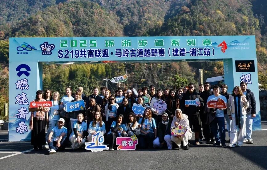 次日,留学生们一早便前往乾潭镇梓洲村,体验环浙步道系列赛—S219共富联盟·马岭古道越野赛。作为《富春山居图》实景延伸段,马岭古道串联起丹霞赤壁、千年驿道、竹海云梯等绝美景观,是浙江唯一入选长三角十大经典徒步线路的古道。选手们的飒爽身姿与古道美景相映,热烈氛围感染着每一位留学生。