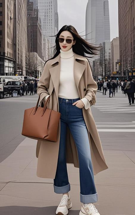参考灵感:网页1中卡其色风衣与牛仔裤的组合,结合网页5的九分裤显高技巧。