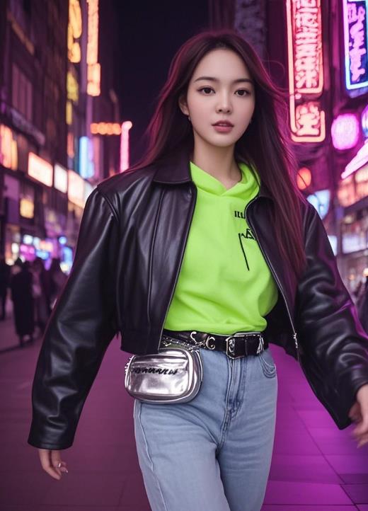 搭配三:个性潮流风上衣:oversize黑色皮衣(内搭荧光绿短款卫衣)裤子:浅蓝阔腿牛仔裤鞋子:银色未来感厚底运动鞋配饰:金属链条腰带+机能风腰包风格解析:皮衣的硬朗与阔腿裤的洒脱结合,荧光色内搭提亮整体,银色运动鞋强化科技感,适合音乐节或街拍。