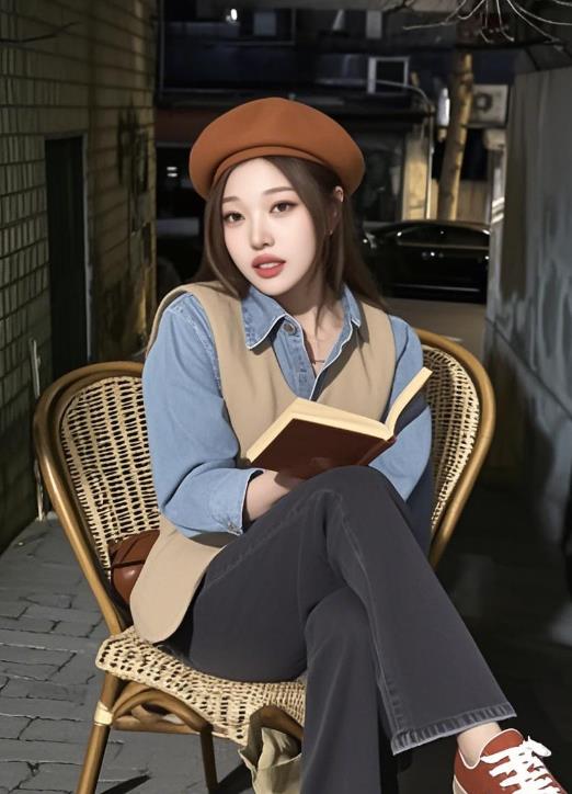搭配二:复古文艺风上衣:做旧牛仔衬衫(叠穿燕麦色针织马甲)裤子:黑灰色微喇牛仔裤鞋子:棕红色复古跑鞋配饰:贝雷帽+帆布邮差包风格解析:牛仔叠穿打造复古基调,微喇裤型修饰腿型,棕红色跑鞋与贝雷帽色彩呼应,文艺感拉满。