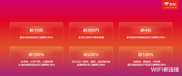 健康消费成为市场新热点。体重管理用药、补益用药的成交新用户数同比增长超5倍;以燕窝、阿胶为代表的传统滋补品和鱼油、赖氨酸等现代营养补充剂,以及动态血糖仪、呼吸机等健康器械的成交额同比增长超2倍。新能源相关品类持续高速增长,自营电动自行车成交额同比增长500%,新能源汽车充电桩增长102%。京东全球购服饰品类成交额同比增长300%,浪琴品牌同比增长超10倍,百年品牌STANLEY、白鹤分别同比增长40倍、5.7倍。