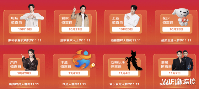 从10月16日起,电玩惊喜日、爱家惊喜日、上新惊喜日、花少惊喜日、风尚惊喜日、球迷惊喜日、吃喝玩乐惊喜日、暖暖惊喜日共八大惊喜日将轮番来袭。届时,不仅会有覆盖众多品类的特色好物,更将有一系列好玩有趣的活动,让每位用户都能找到属于自己的惊喜消费体验。