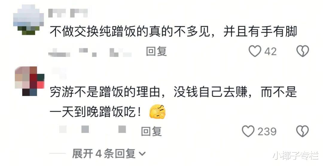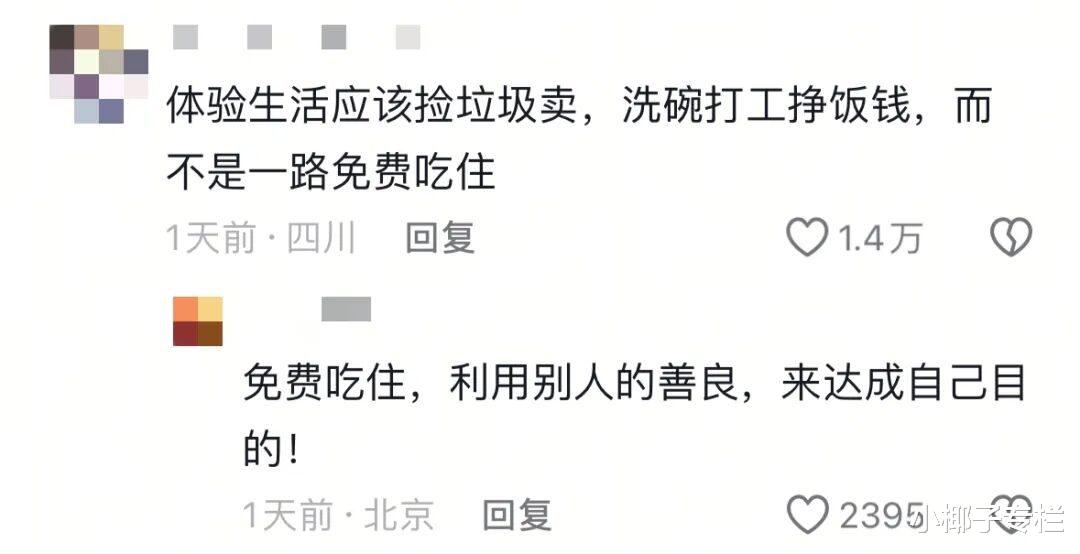 毕竟正如评论区所说:“体验生活应该捡垃圾卖,洗碗打工挣饭钱,而不是一路免费吃住。”