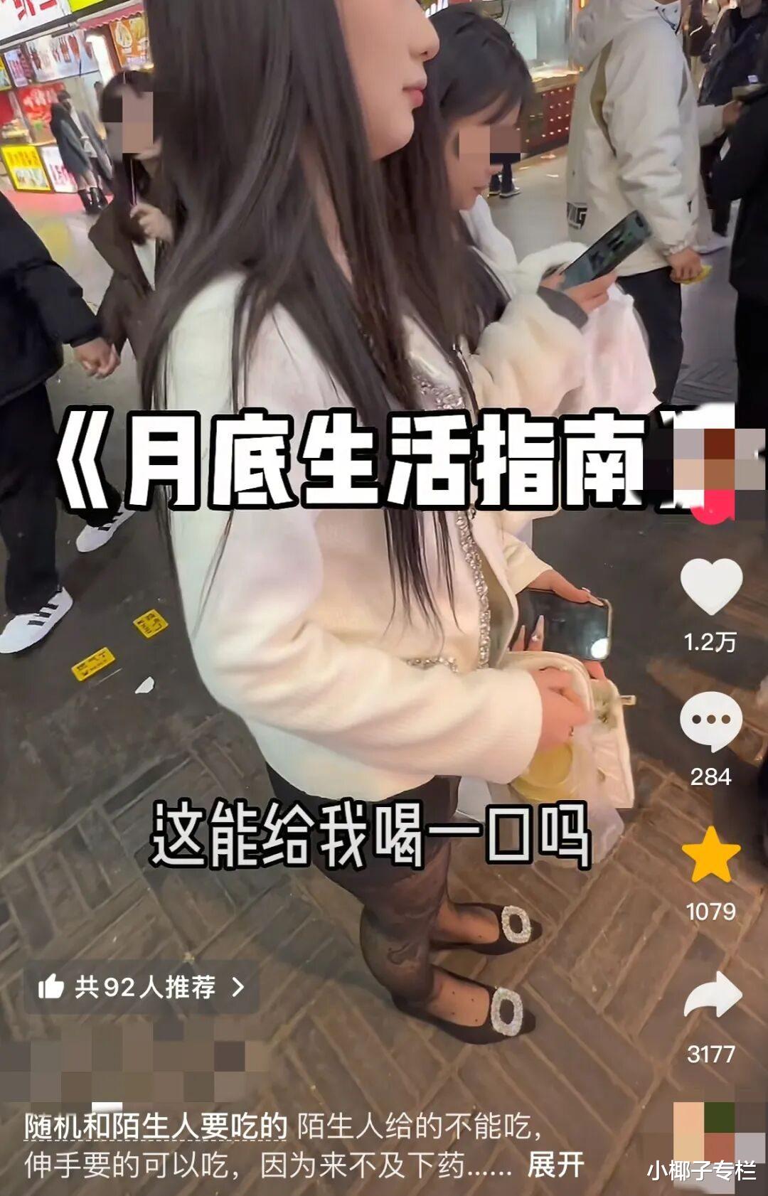 比如,有博主挑战随机和陌生人要吃的,见到漂亮小姐姐上去就问:“这能给我喝一口吗?”