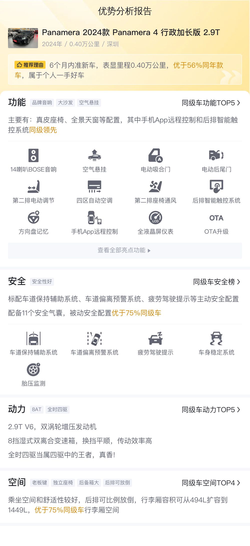 该车在综合表现上有着明显的优势,主要体现在以下几个方面:首先,作为保时捷品牌旗下的车型,其品牌价值和市场认可度较高,具有较好的保值能力。其次,车辆搭载的2.9T V6发动机和8挡双离合变速箱提供了出色的动力性能和平顺的驾驶体验。再次,行政加长版车型拥有更宽敞的乘坐空间和更豪华的配置,提升了乘坐的舒适性和实用性。最后,车辆配备了丰富的驾驶辅助和智能互联功能,提高了驾驶的安全性和便捷性。