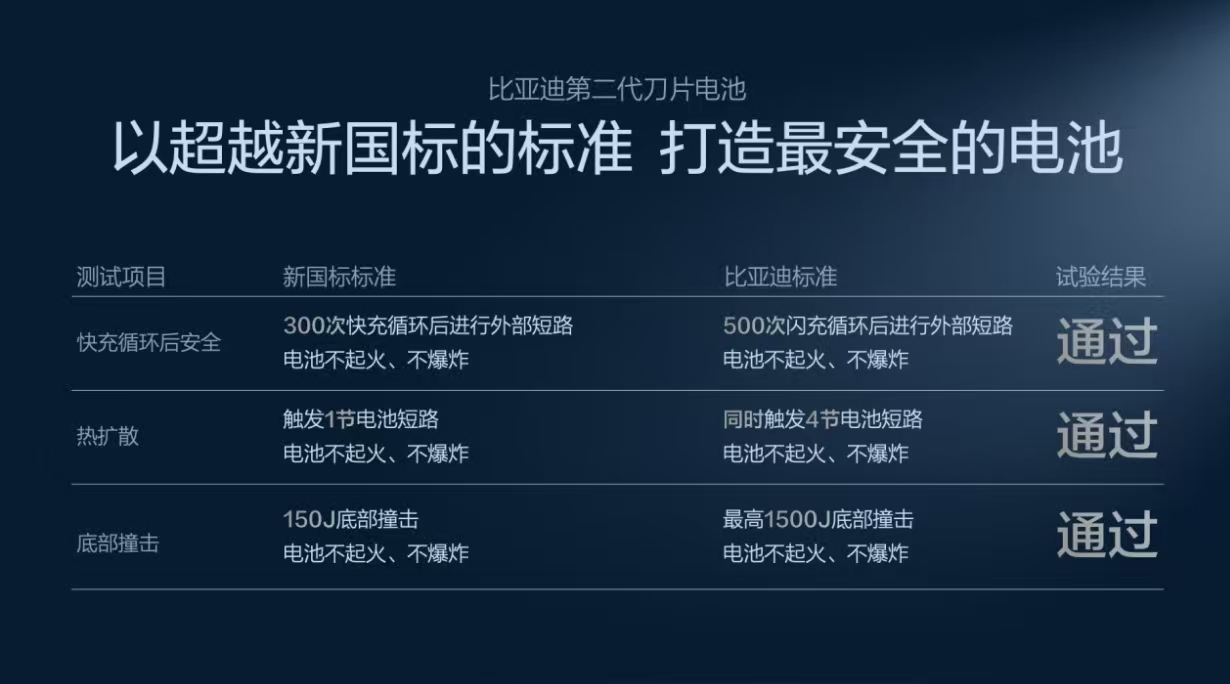 安全层面,第二代刀片电池以远超新国标的标准完成多项极限测试:500次闪充循环后边闪充边针刺无热失控,超国标300次快充循环要求;热扩散试验同时触发4节电池短路仍无热扩散,底部撞击试验通过10倍新国标撞击能量测试,全场景守护出行安全。