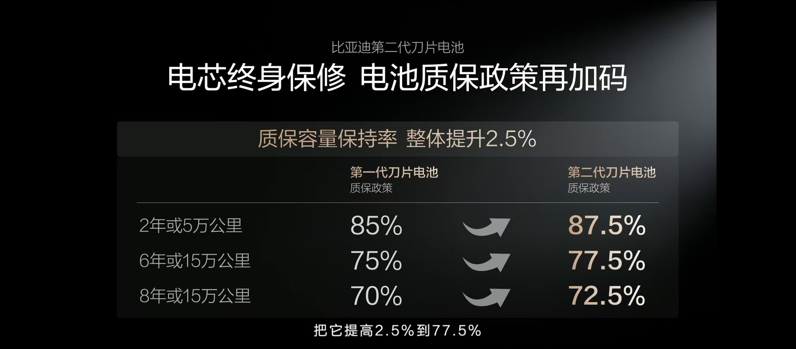 同步加码的质保政策更给用户吃下定心丸,各质保周期内电池容量保持率均提升2.5%,如6年或15万公里周期内标准从75%提至77.5%,不达标可免费包换,且电芯实现终身保修,覆盖车辆全使用周期。