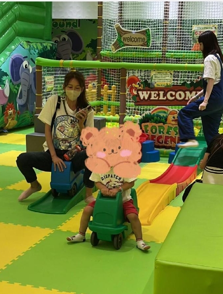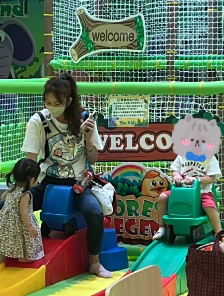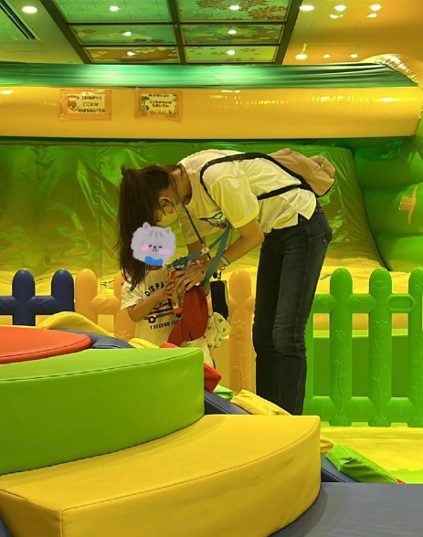 从照片中可以看到,林志玲当天的穿着相当随意,一件印有机器猫图案的短袖T恤,既休闲又不失童趣。她背着妈妈包,挎着水杯,与周围的小女孩互动愉快。尽管身高高达175cm,但为了儿子,她不惜坐在矮小的玩具车上,十分可爱。