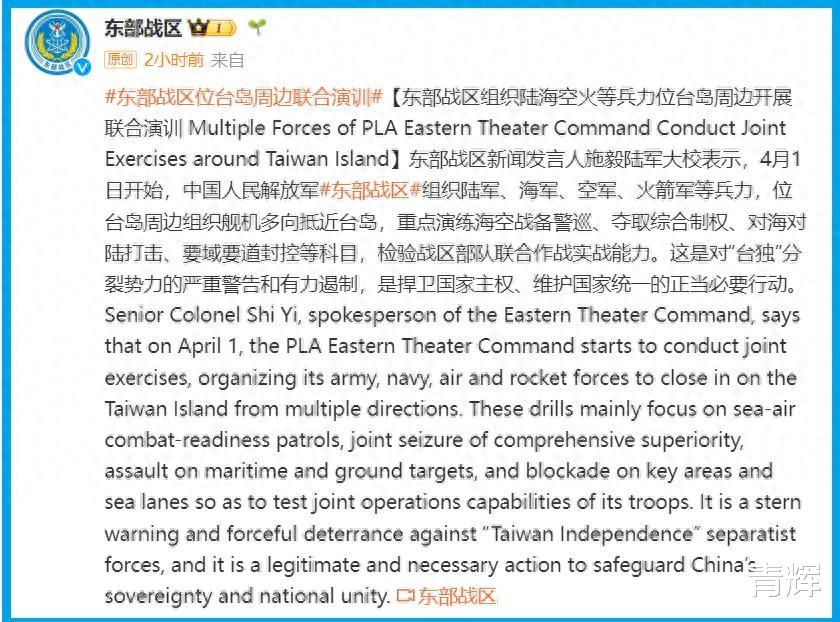 4月1号当天早上,东部战区用双语对外发布公告——台海联合大演习开始了。