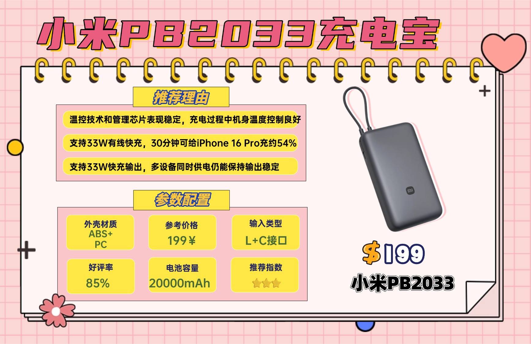 小-米PB2033容量20000mAh,额定12000mAh,支持33W有线快充,30分钟可给iPhone 16 Pro充约54%。自带双向Type-C线,充电和自充都比较方便。