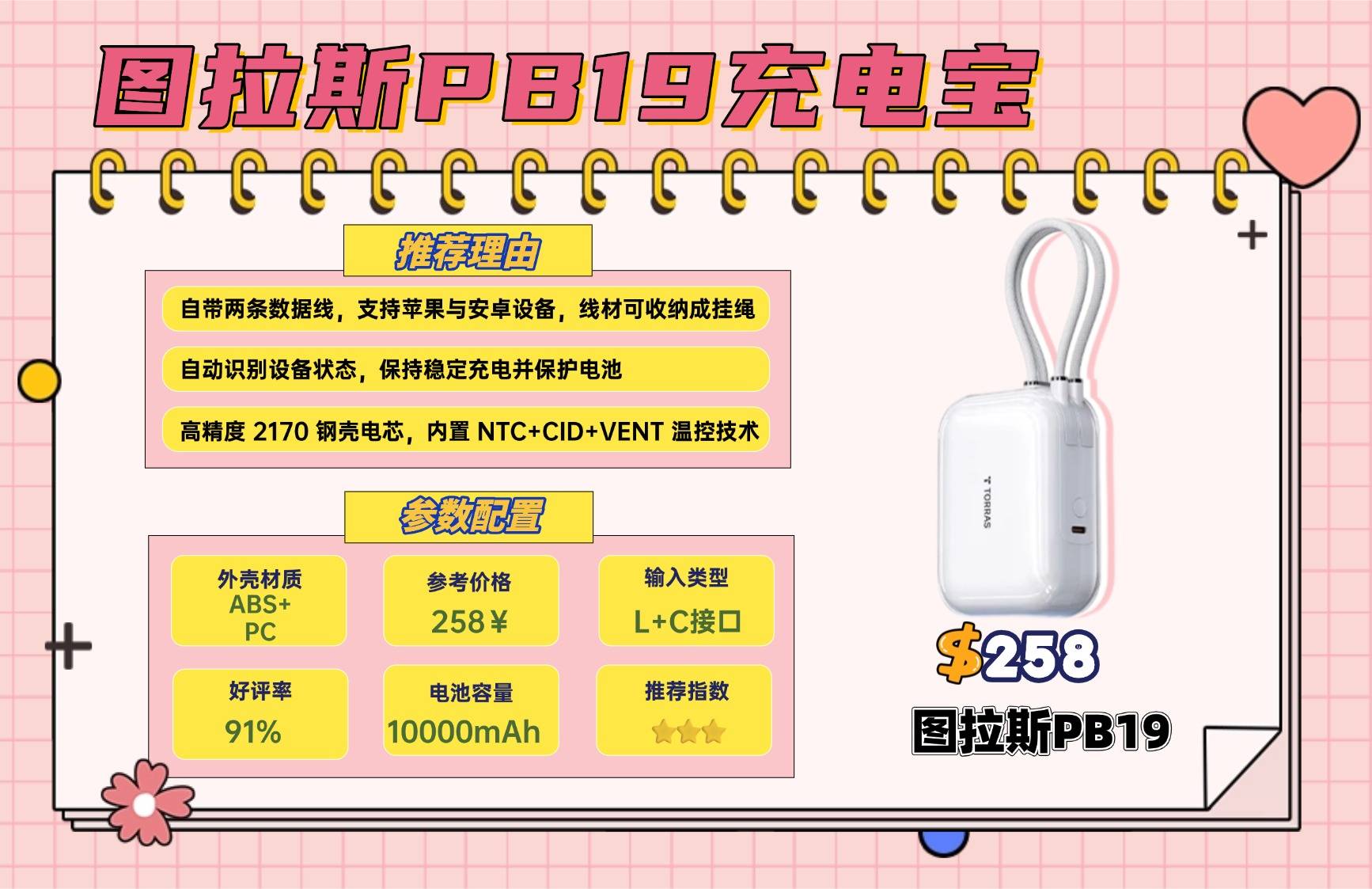 图-拉斯PB19容量10000mAh,额定6500mAh,体积小巧,配备两条自带线,一条兼容苹果/安卓设备,收纳时可当手提绳使用。充电线采用尼龙编织,耐磨性明显好于普通线材。