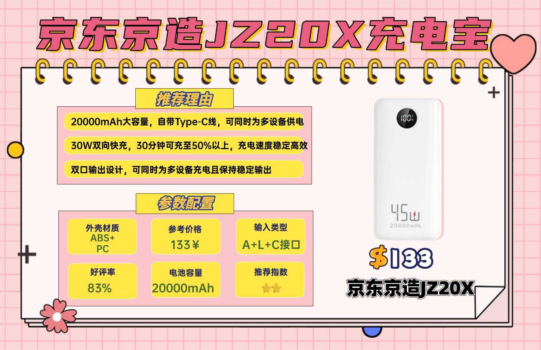 京-东京造JZ20X容量20000mAh,30分钟可充至50%以上,支持Type-C双向30W快充。双口输出仍能保持较快充电速度,自充最高90W,短时间补电效率高。