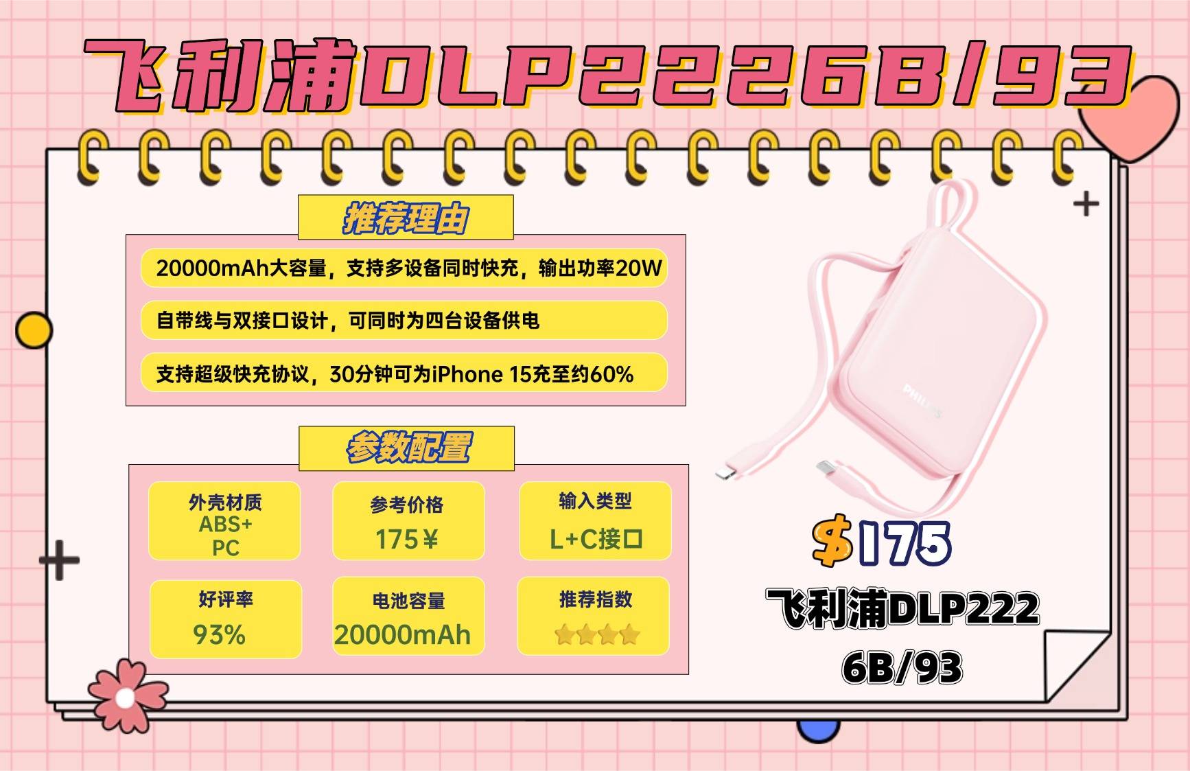 飞-利浦DLP2226B容量20000mAh,额定12000mAh,实际可以给苹果15Pro充约4次电。机身自带两根Type-C和Lightning线,收纳方便,可当挂绳使用,单手握持尚可,但重量300多克,长时间手持略累。