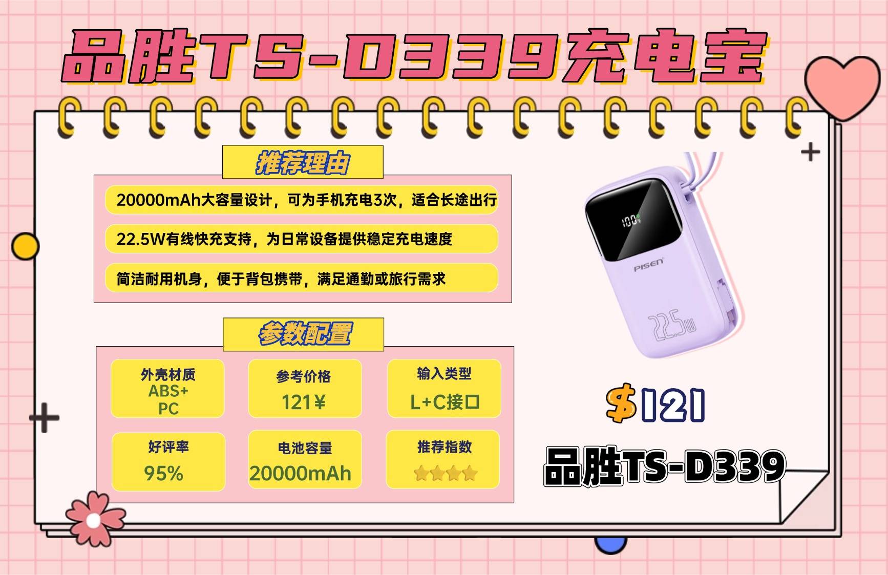 品-胜TS-D339是一款注重实用性的充电宝,20000mAh容量足够为手机充电3-4次。充电功率22.5W,对普通手机日常使用来说速度尚可,但比起新款快充略显保守。