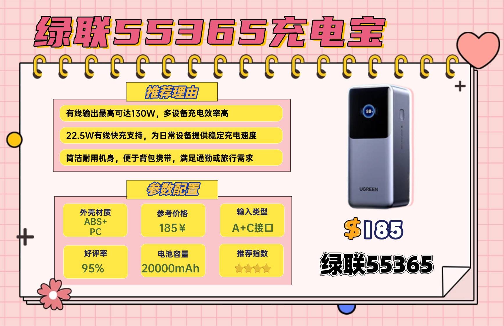 绿-联55365容量20000mAh,最大有线输出可达130W,支持苹果MagSafe和多种安卓快充协议。实际使用中,能快速为手机、平板或小型笔记本补充电量,同时多设备充电也不会明显掉速。