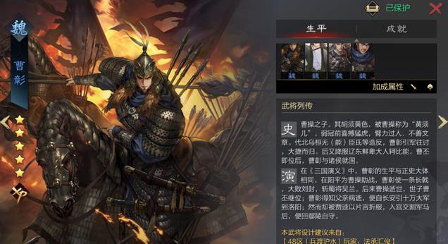 除了自身的考据与原创,《率土之滨》还积极引导玩家中的三国爱好者参与对三国内容的共创,一起反哺三国。下图中的武将曹彰,就是出自48区玩家:法承汇俊的设计建议。