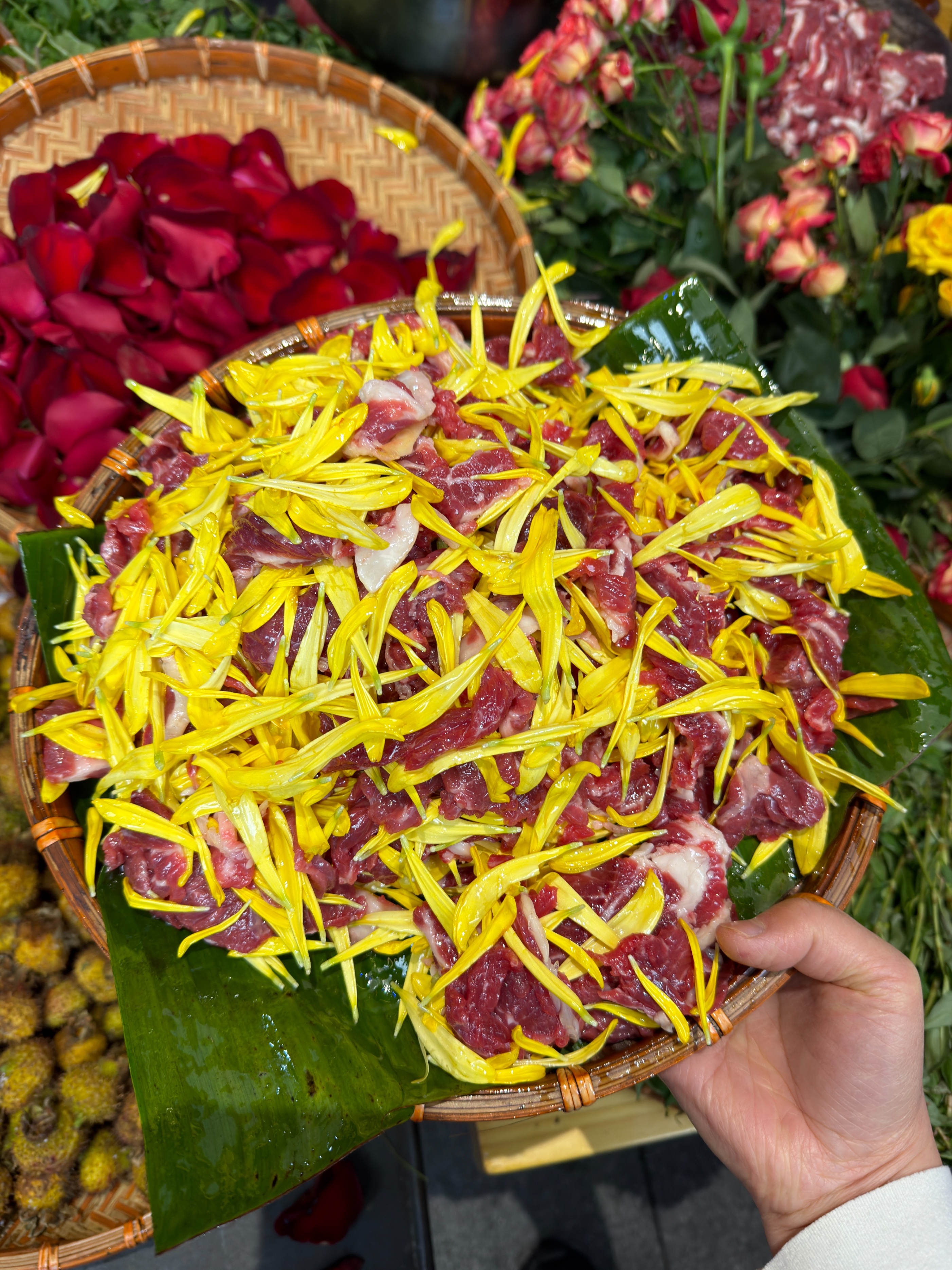 沙葱牛肉中,辛香的山野沙葱裹着关岭黄牛最嫩的吊龙部位;树番茄牛肉里,野生树番茄的果酸完美中和肉香;刺梨鸡片搭配野刺梨果片,维生素与鲜嫩鸡肉碰撞;木姜子小黄牛则用山野木姜子独特的辛香渗透每一丝肉纤维。