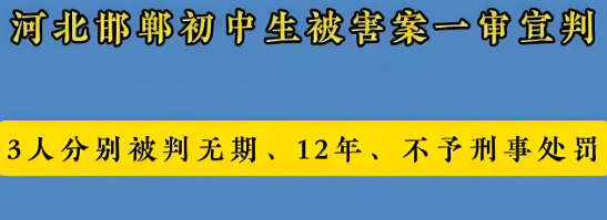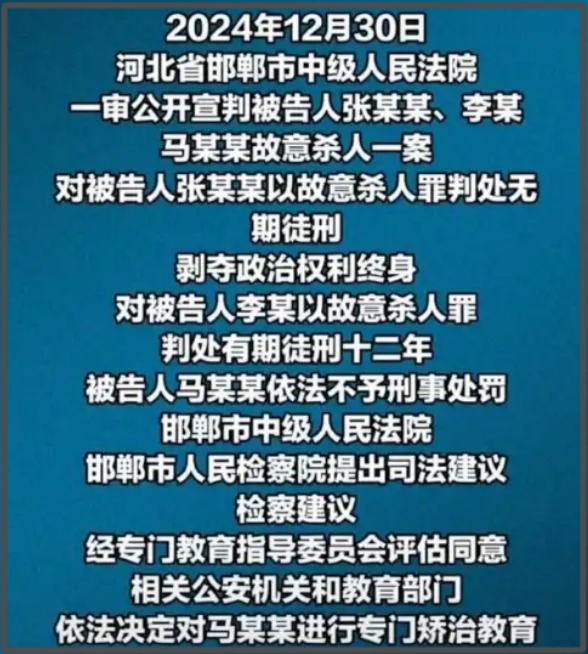 北京时间12月30日,被广大网友密切关注的邯郸市初中生被害案,河北省邯郸市中级人民法院一审公开宣判:故意杀害邯郸市初中学生王某的三名被告人张某、李某和马某故意杀人一案的判决,对主犯张某以故意杀人罪判处无期徒刑,并剥夺政治权利终身;对李某以故意杀人罪判处有期徒刑12年;被告人马某不予刑事处罚。