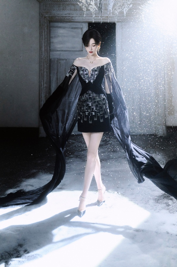 而下摆的裙摆设计则充满了巧思,薄纱拼接的部分为整个造型增添了一份轻盈与灵动,仿佛仙女的裙摆随风飘动。