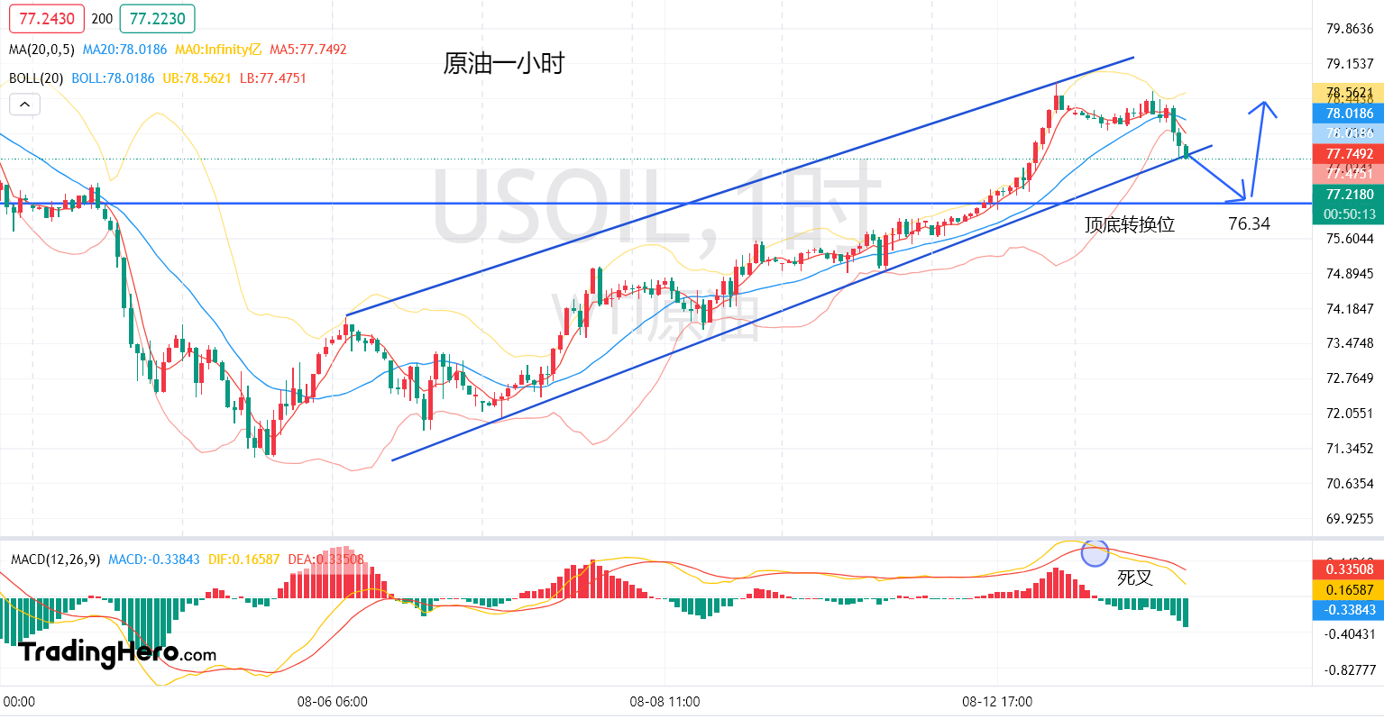 总结:目前原油一小时下降动力十足,晓杨建议在77.22直接做空,目标76.34,到位后止跌看多。