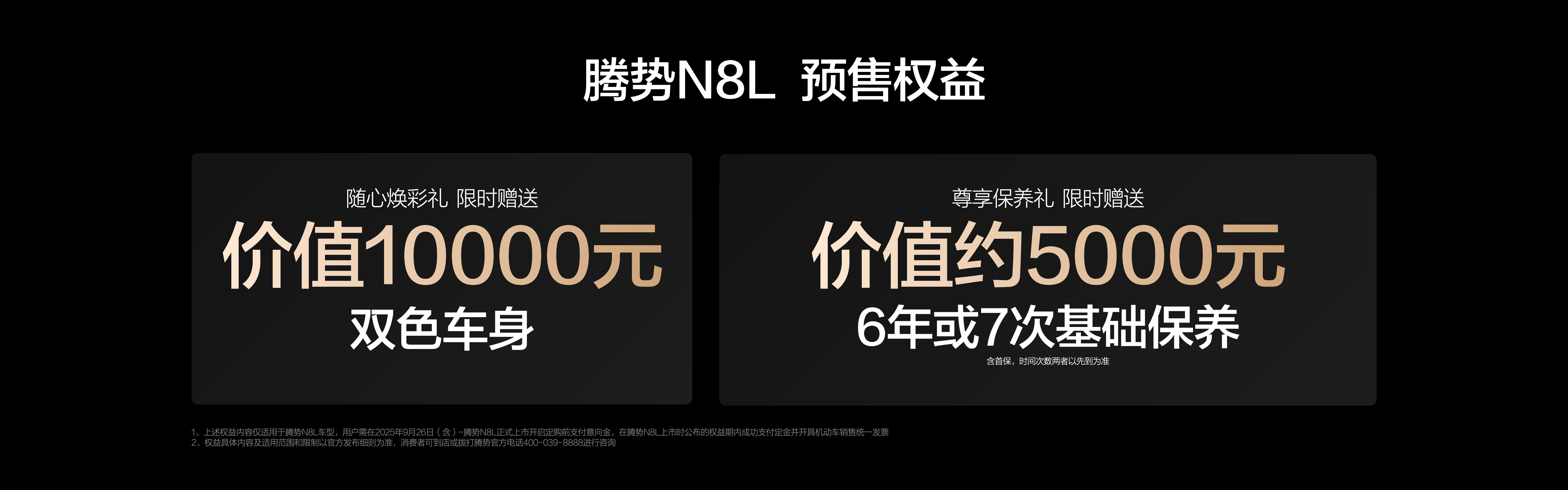 又一款给家庭出行设计的汽车上市,目标成为全家三代人的满意之选,腾势 N8L 正式开启预售,预售价 31.98 万 - 34.98 万元。