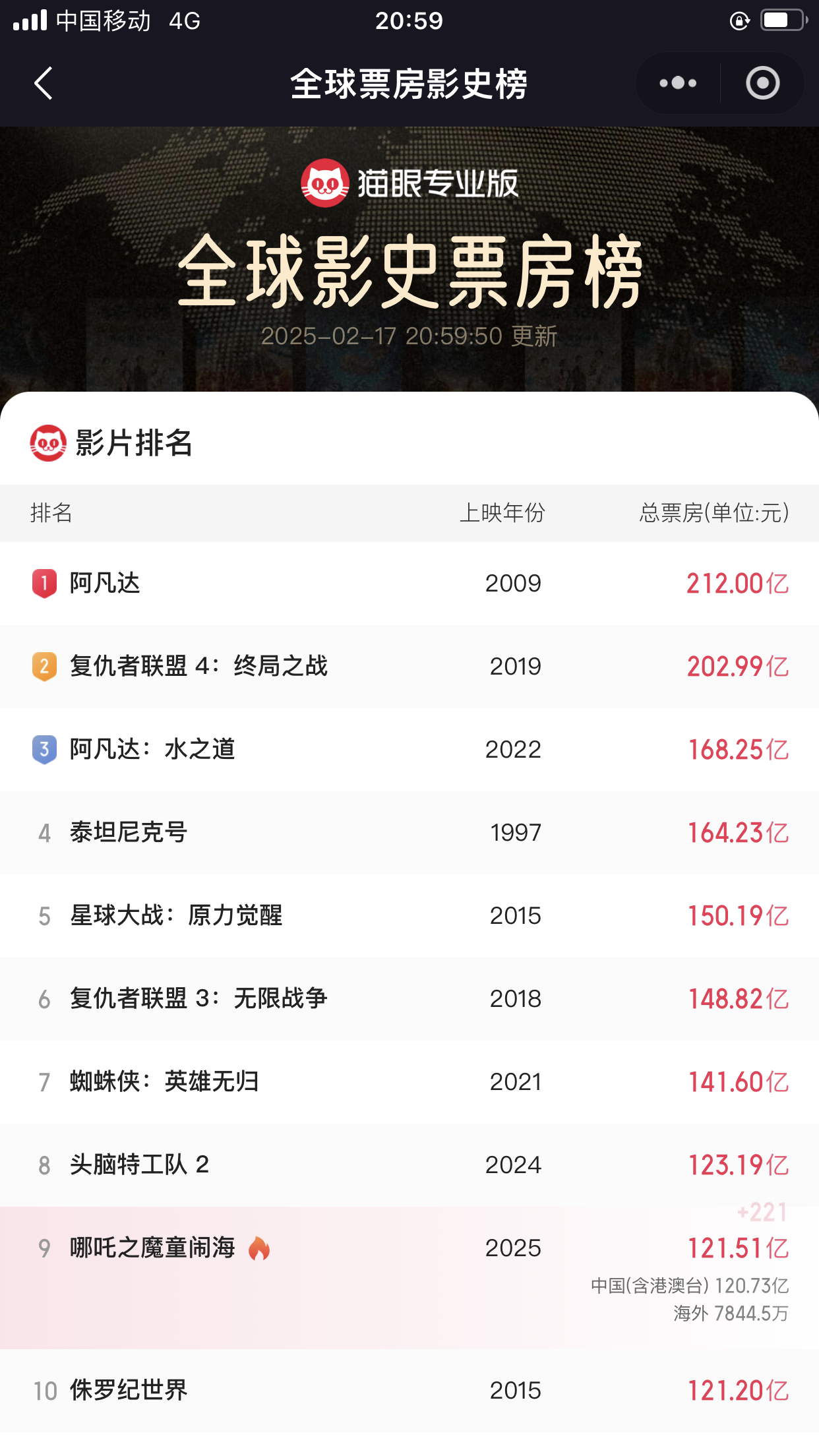 据猫眼全球票房榜显示,截至2月17日,影片《哪吒之魔童闹海》全球票房(含预售)突破121.51亿元,超过《侏罗纪世界》进入全球影史票房榜前9名。从14日北美开票,三天时间海外票房已累积7800多万元,后续海外票房发力值得期待。