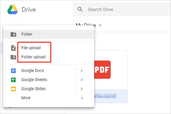 方法 5:借助谷歌云端硬盘,无需 USB 线将电脑数据传输至安卓手机除了上述方法,谷歌云端硬盘这类云存储工具也能实现无 USB 线传输。先在电脑上登录谷歌云端硬盘,将需要传输的文件上传至云端,再在安卓手机上登录同一账号,即可下载这些文件。 请注意,两次登录的谷歌账号必须保持一致。(如果遇到谷歌云端硬盘在安卓设备上无法使用的问题,可参考相关解决方案解决。) 借助谷歌云端硬盘传输文件的具体步骤:
