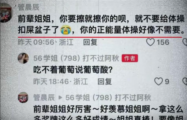 而这个体操运动员就是管晨辰,她就在吴柳芳的视频里进行了评论:前辈姐姐,你擦就擦你的呗,就不要个体操扣屎盆子了。